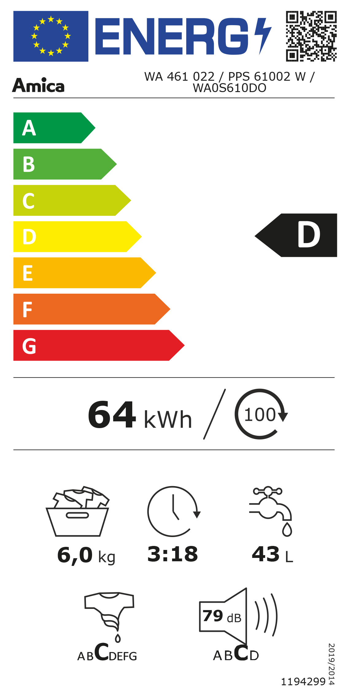 6,0 kg Fassungsvermögen, max. 1000 U/min, Drehwähler für Programme, 23 Programme, Türverriegelungsanzeige, Kindersicherung, Schaumerkennung, automatisches Unwuchtsystem, Überlaufschutz, 3 Programme mit einstellbarem Programmende 3/6/9 h, Technische Daten (Referenzprogramm: ECO 40- 60°C): Energieeffizienzklasse: D (Spektrum A-G), Schleudereffizienzklasse: C, Luftschallemissionsklasse: C, Energieverbrauch pro 100 Waschzyklen: 65,0 kWh, Gewichteter Wasserverbrauch (pro Betriebszyklus): 43 l, Programmdauer Vollbeladung: 03:18 (h:min), Luftschallemission: Schleudern 80 dB (A) re 1 pW, Einfüllöffnung (Ø): 300 mm, Türöffnungswinkel: 145 °, Türdurchmesser: 480 mm, Türanschlag: links, Anschlusswert/Absicherung: 2,05 kW / 10 A, Spannung/Frequenz: 220-240 V / 50 Hz, Kabellänge: 150 cm, Schlauchlänge Zu-/Ablauf: 100 / 160 cm