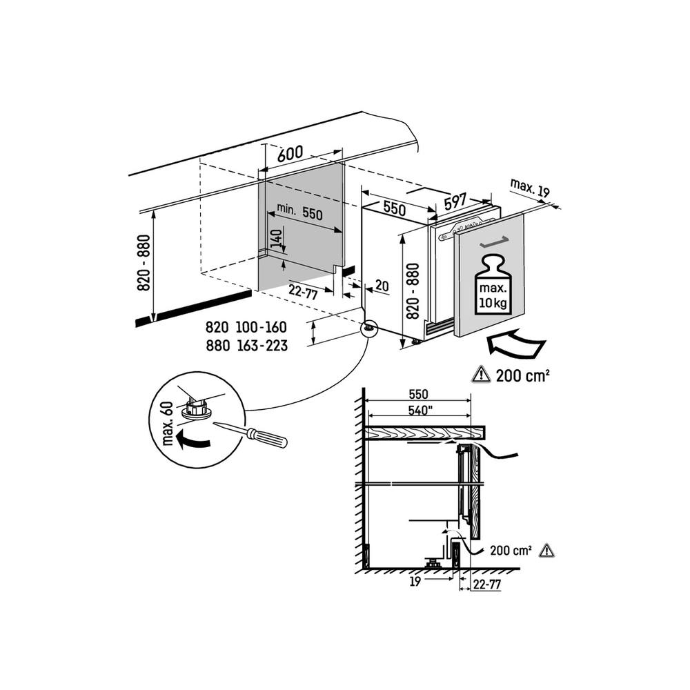 Der VarioSockel ermöglicht eine Anpassung an die Küchenmöbel in Höhe und Tiefe.Alle vier Stellfüße sind von vorne mit einem Verstellweg von 60 mm einstellbar. Außerdem kann das Lüftungsgitter variabel an die Küchenfront mit einem Verschiebeweg von 55 mm angepasst werden.